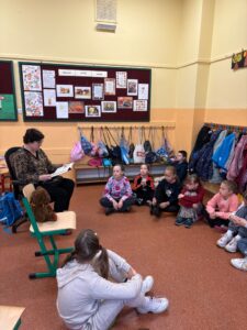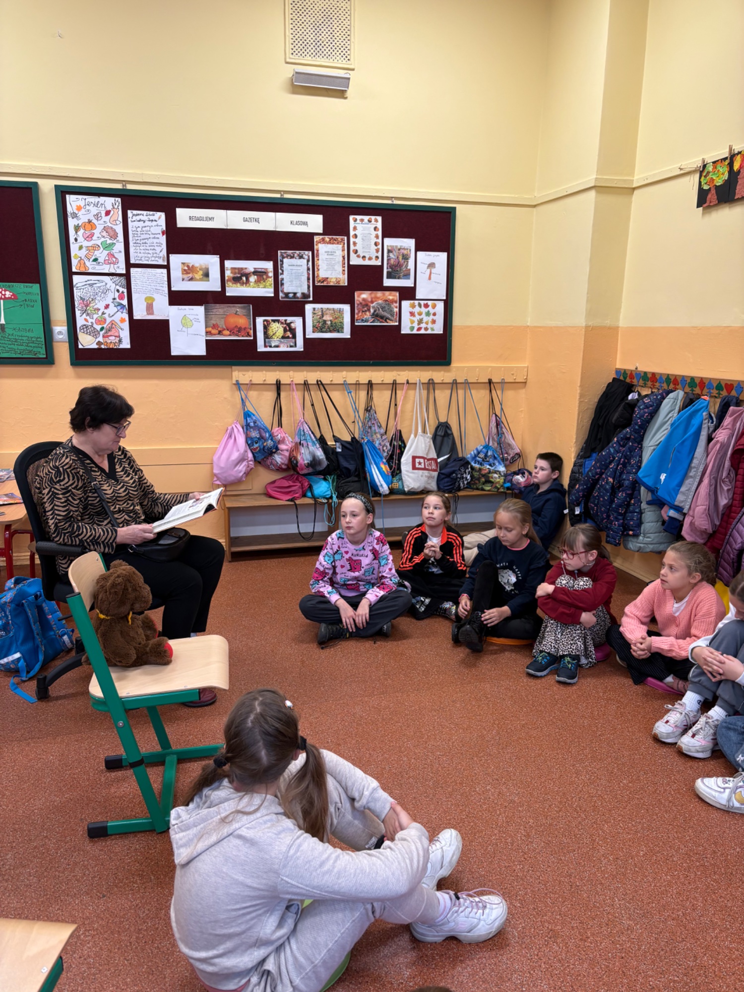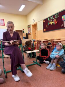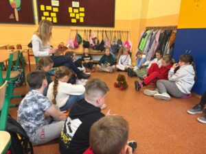 ,, Dziadek i niedźwiadek”, bo o tej lekturze mowa, jest doskonałą książką dla młodych czytelników, którzy lubią zwierzęce historie i chcą poznać polską historię. Uczniowie pokochali tę lekturę i z wielkim skupieniem i zainteresowaniem słuchali pięknie czytających gości. To był niezwykły czas. Wszystkiemu przysłuchiwał się nasz klasowy niedźwiadek -Miodek.
