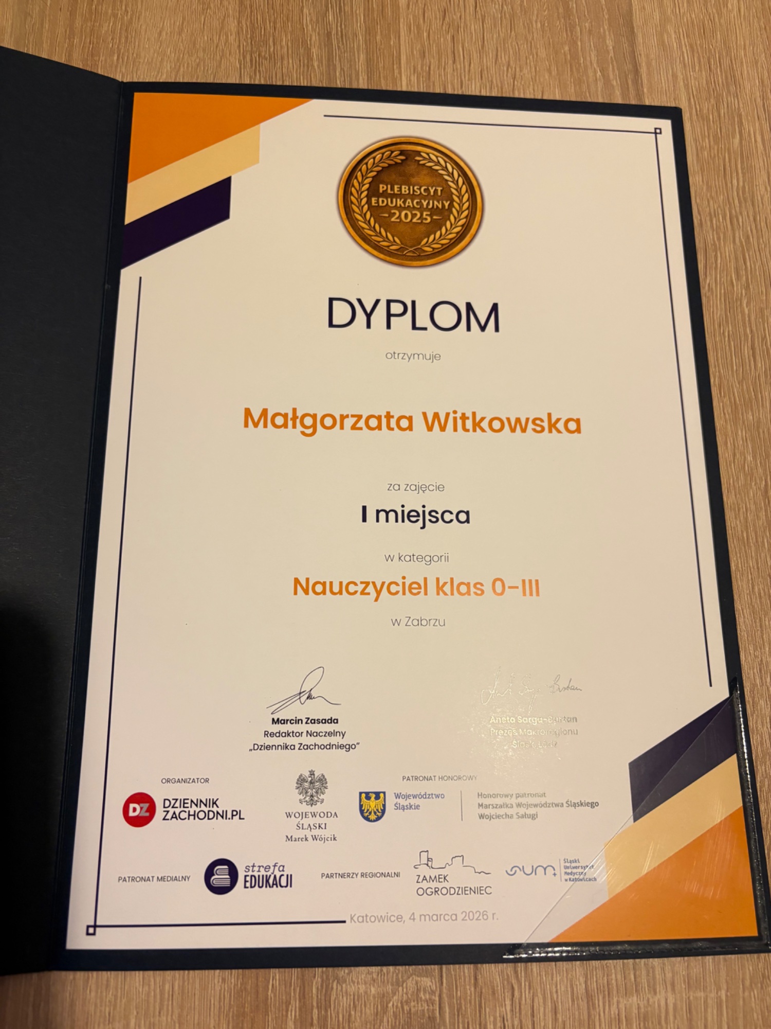 Pani Małgorzata Witkowska, nauczycielka naszej szkoły, uczestniczyła w uroczystym spotkaniu podsumowującym PLEBISCYT EDUKACYJNY 2025w Katowicach. Zajmując I miejsce, została uhonorowana medalem oraz pamiątkowym dyplomem przyznawanym w ramach konkursu organizowanego przez,, Dziennik Zachodni”.