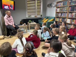Kolejny raz uczniowie klas I-III wraz z Panią Agnieszką Kruk i wychowawcami klas spotkali się w Bibliotece Miejskiej z pieskiem ze schroniska Psitul mnie. Na początku prowadząca warsztaty, Pani Magda opowiedziała dzieciom o schronisku, o tym jakie zwierzęta w nim przebywają, na czym polega opieka nad pieskami i kotkami.