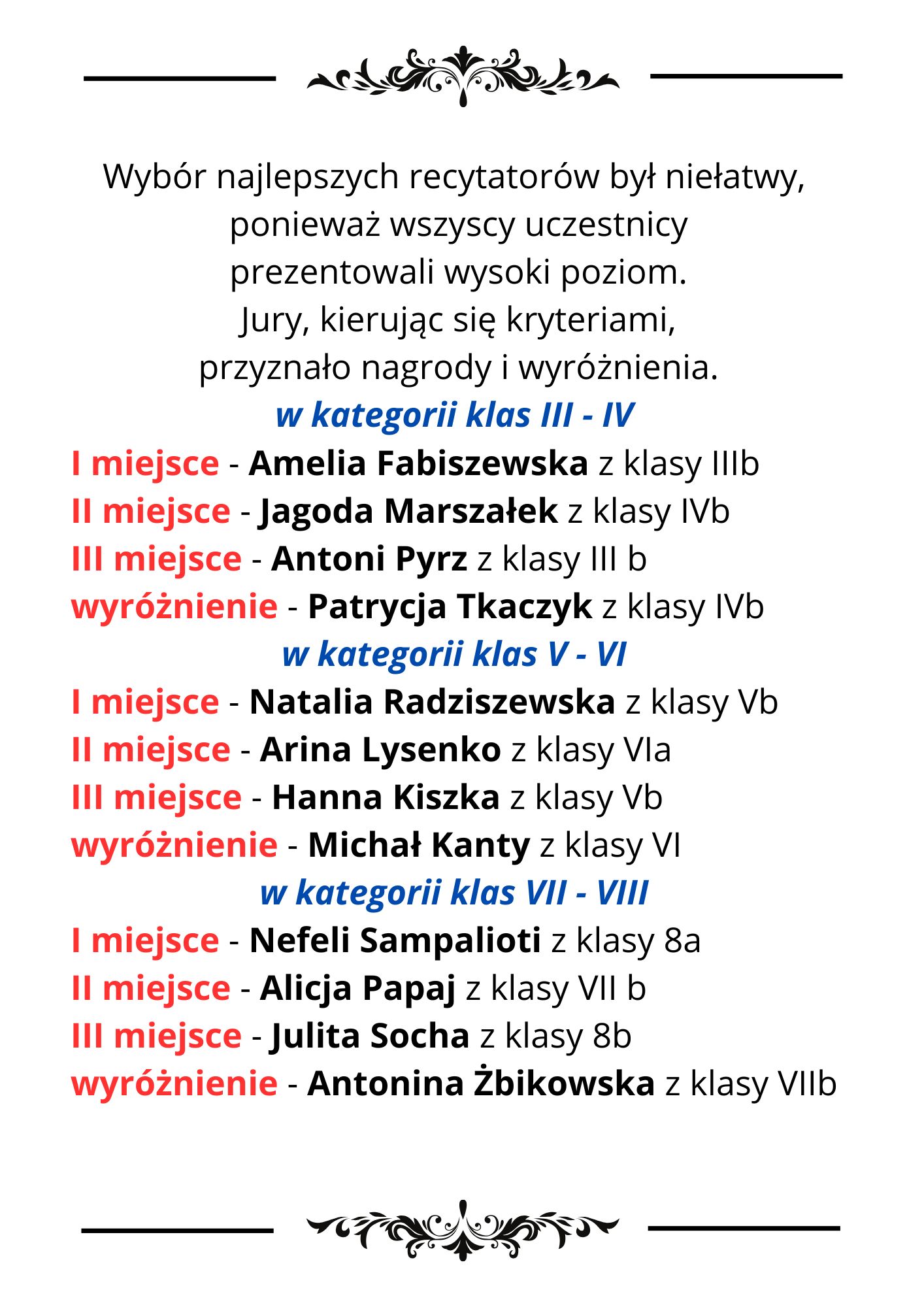 Uczniowie klas od III – VIII zaprezentowali swój kunszt recytatorski, nad którym pracowali w ostatnim czasie. Uczestnicy oceniani byli w 3 grupach wiekowych: