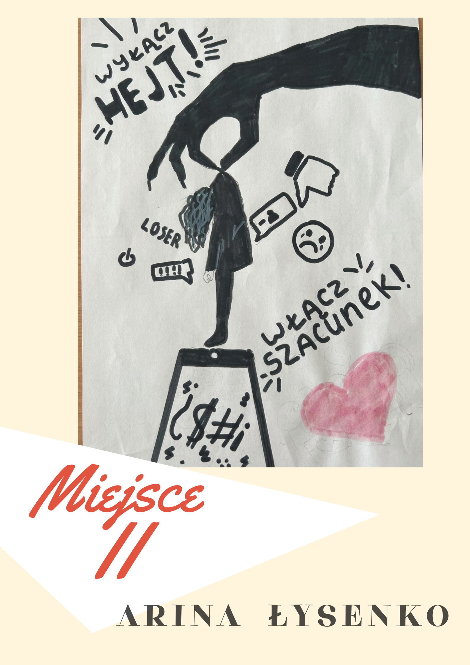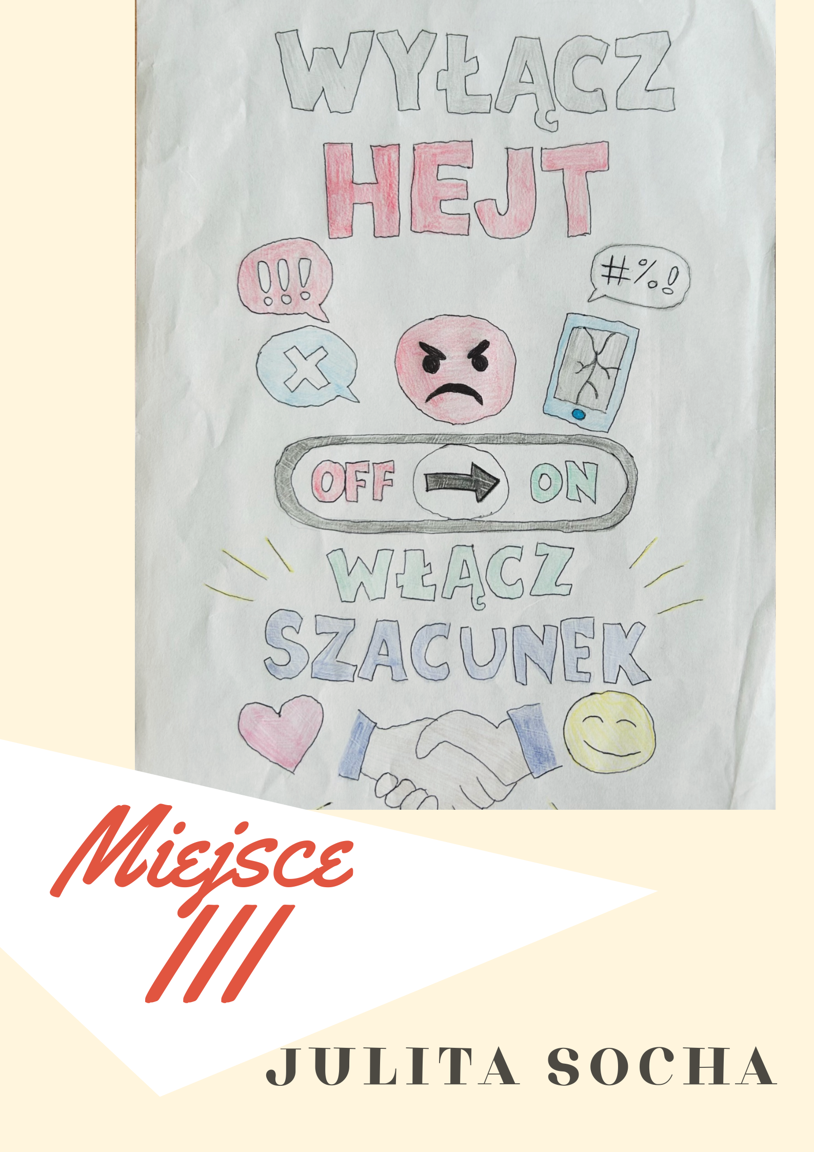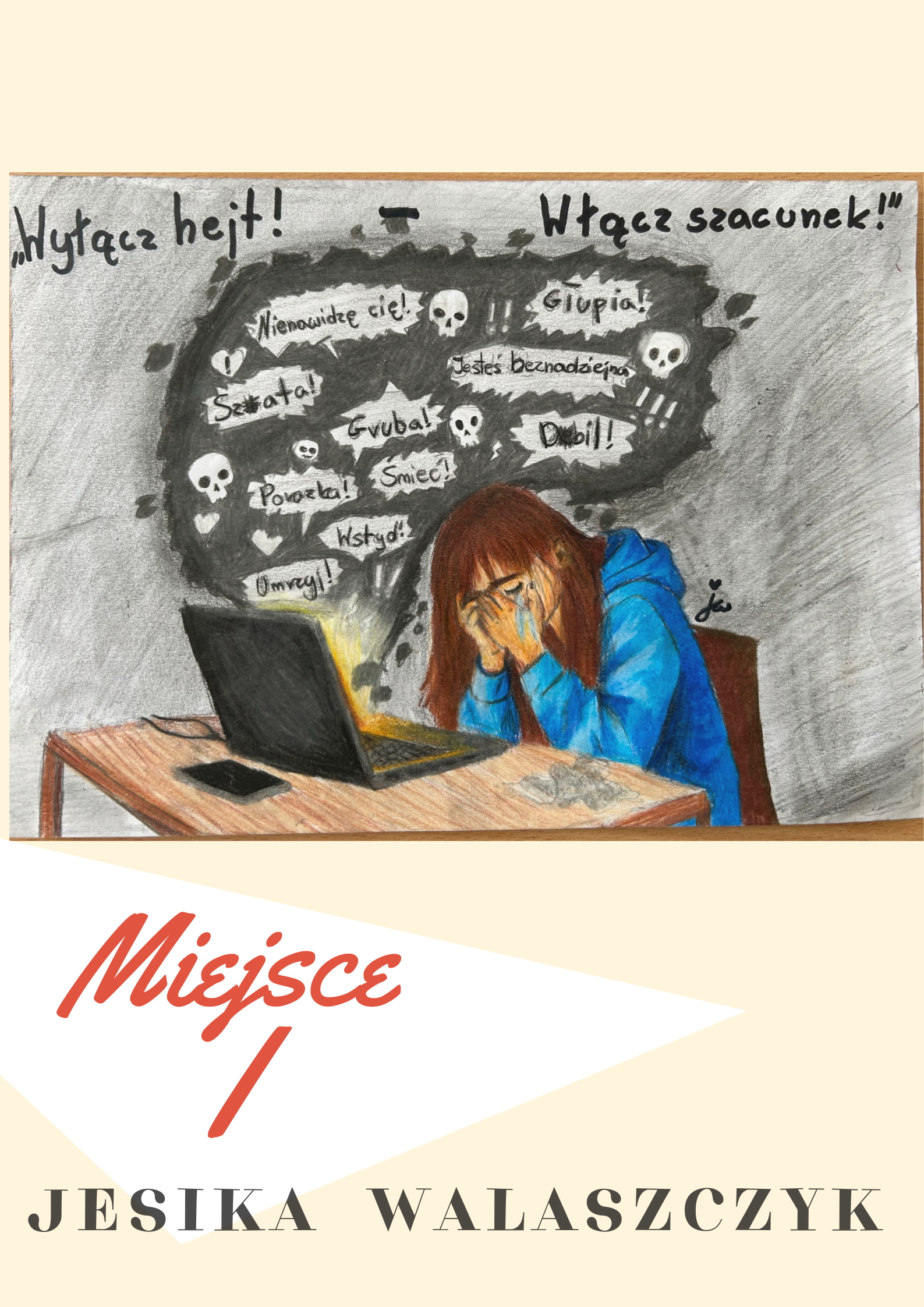 W naszej szkole odbył się konkurs plastyczny o tematyce profilaktycznej, dla uczniów klas 6–8, poświęcony tematyce hejtu oraz cyberprzemocy. Celem wydarzenia było zwiększenie świadomości młodzieży na temat zagrożeń w internecie oraz promowanie szacunku i odpowiedzialności w komunikacji online. Uczniowie wykazali się dużą kreatywnością i zaangażowaniem, przygotowując prace pokazujące, jak ważne jest reagowanie na hejt oraz wspieranie osób dotkniętych cyberprzemocą.