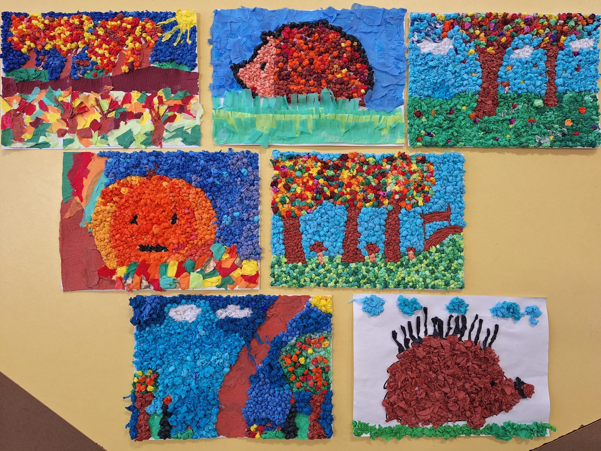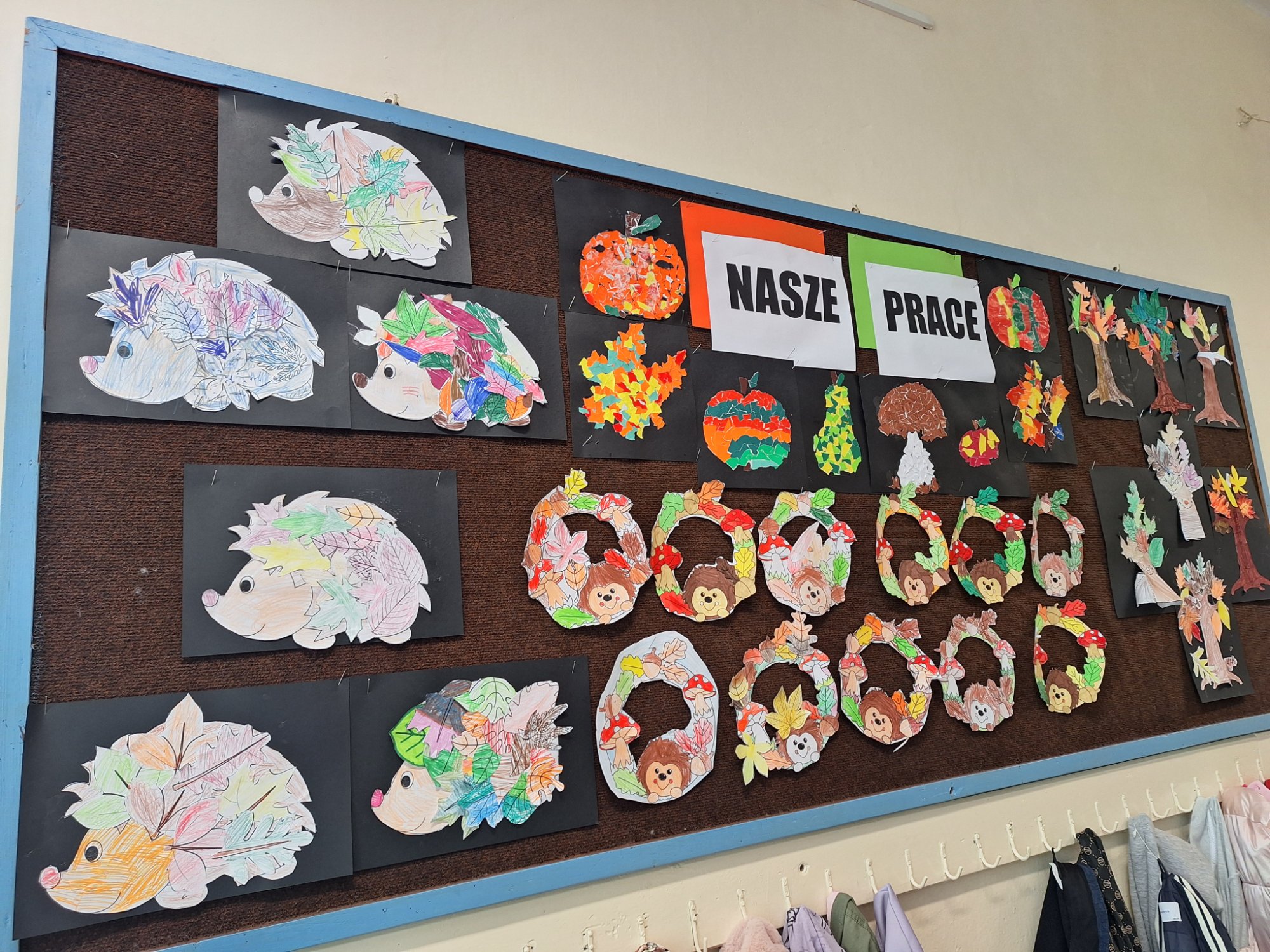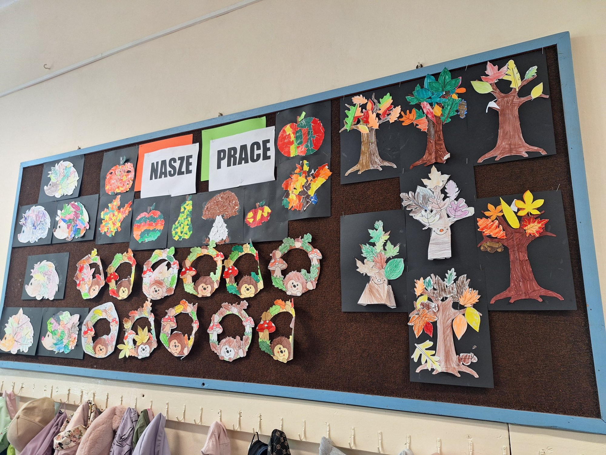 Na świetlicy szkolnej uczniowie klas II i III wykonali prace plastyczne inspirowane jesienią. Dzieci posługiwały się różnymi technikami – rysunkiem, oraz wyklejanką z papieru. W swoich pracach przedstawiły barwne drzewa, spadające liście, jesienne krajobrazy i zwierzęta szykujące się do zimy. Powstała galeria pełna ciepłych, jesiennych kolorów, która ozdobiła świetlicę i wprowadziła wszystkich w nastrojowy klimat tej pory roku.